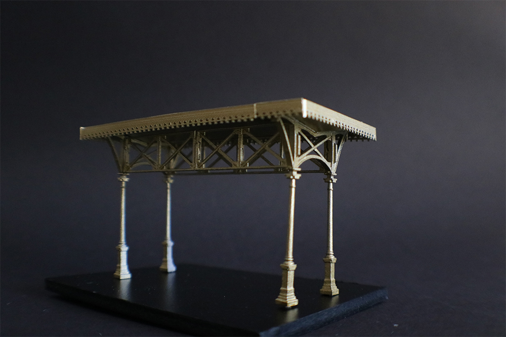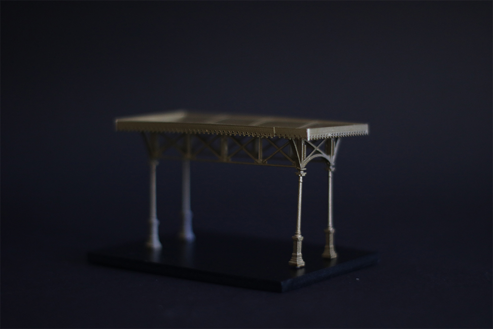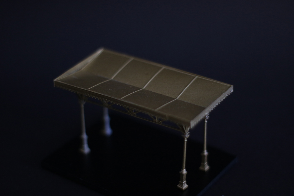 La struttura, realizzata in ottone microfuso e fotoinciso saldati a laser, è caratterizzata dalla presenza di una copertura liscia con nervature di rinforzo e da due colonne che rendono comunque possibile il posizionamento su ogni tipo di marciapiede di stazione, in quanto la larghezza effettiva della struttura è determinata dalle dimensioni della copertura.