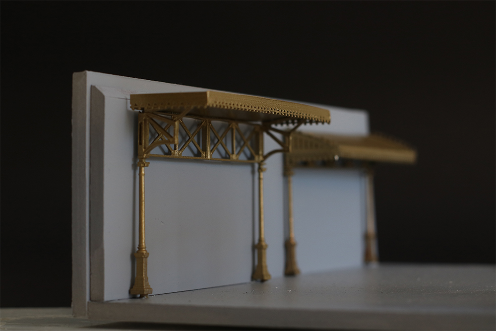 La struttura, realizzata in ottone microfuso e fotoinciso saldati a laser, è caratterizzata dalla presenza di una copertura liscia con nervature di rinforzo e da colonne dotate di perno che rendono possibile il posizionamento su ogni tipo di marciapiede di stazione; dei perni sono presenti anche sul retro della struttura per rendere veloce e stabile l'appoggio a parete.