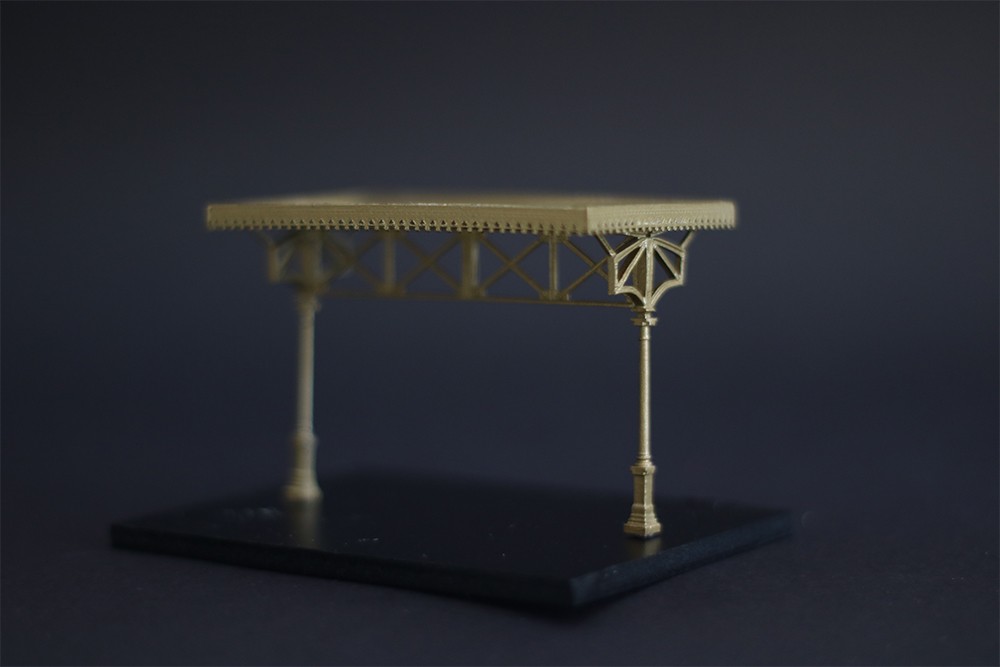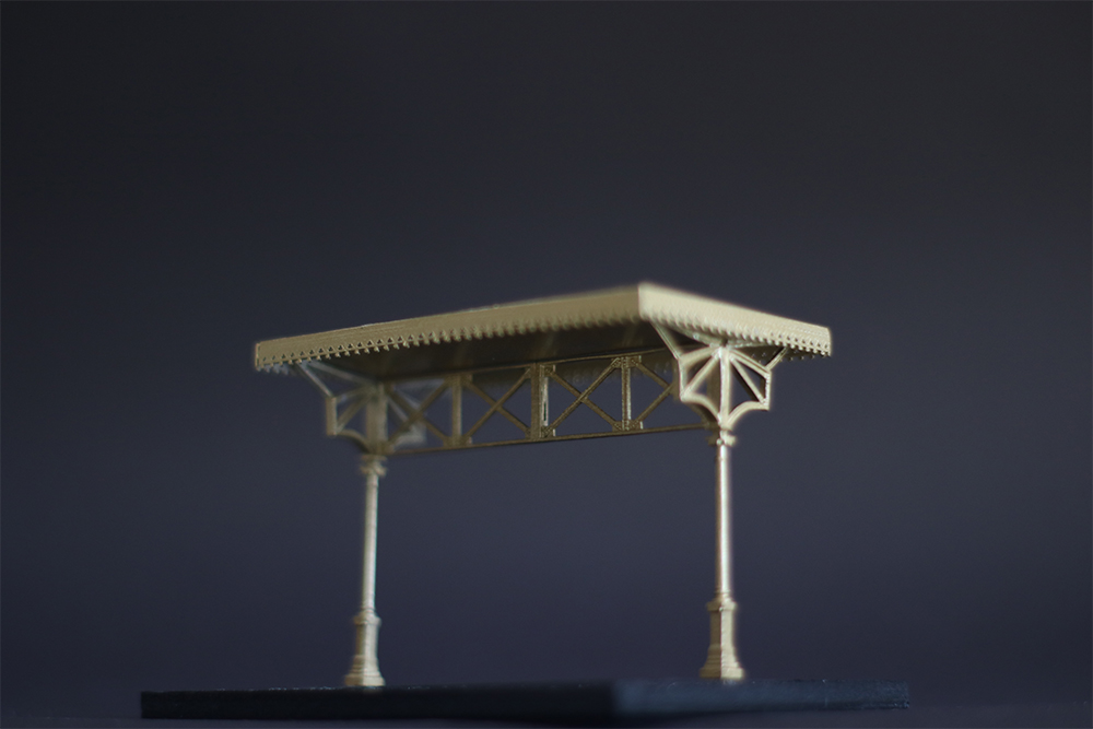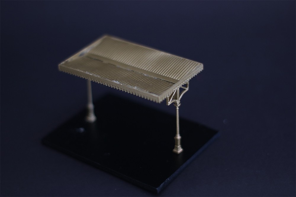 La struttura, realizzata in ottone microfuso e fotoinciso saldati a laser, è caratterizzata dalla presenza di una copertura in lamierino ondulato e da una singola colonna centrale che ne permette il posizionamento su ogni tipo di marciapiede di stazione, in quanto la larghezza effettiva della struttura è determinata dalle dimensioni della copertura.