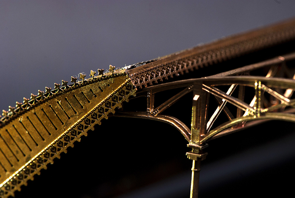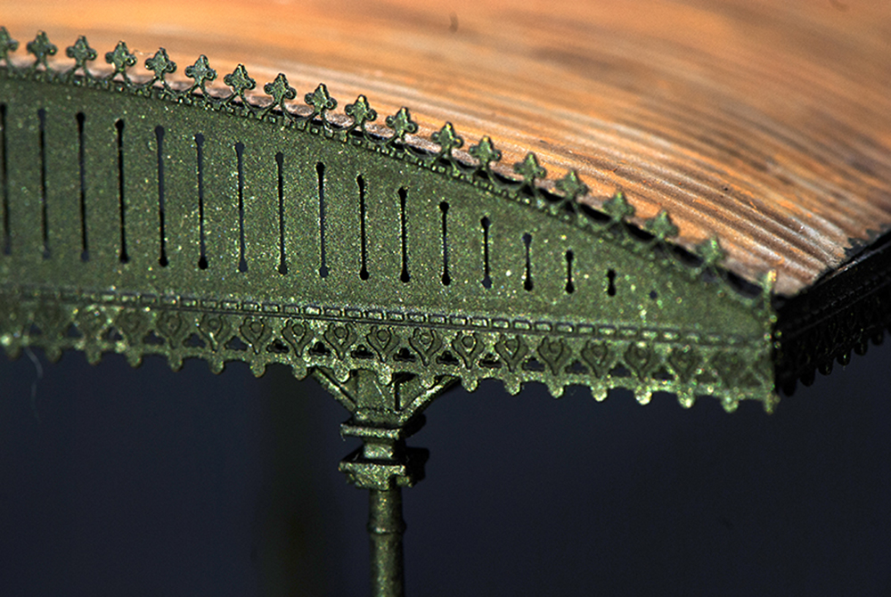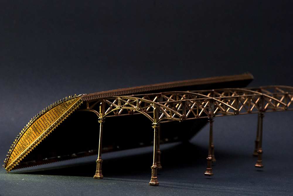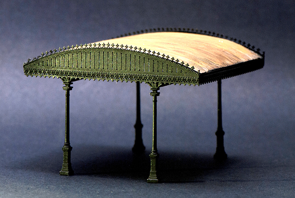 La caratteristica struttura, riprodotta utilizzando immagini e disegni dell’originale ancora presente nella stazione di Roma Trastevere, è realizzata in ottone microfuso e fotoinciso saldati a laser. La pensilina presenta una copertura curva ondulata che ne stabilisce le dimensioni: larghezza mm. 80 x lunghezza mm. 95.