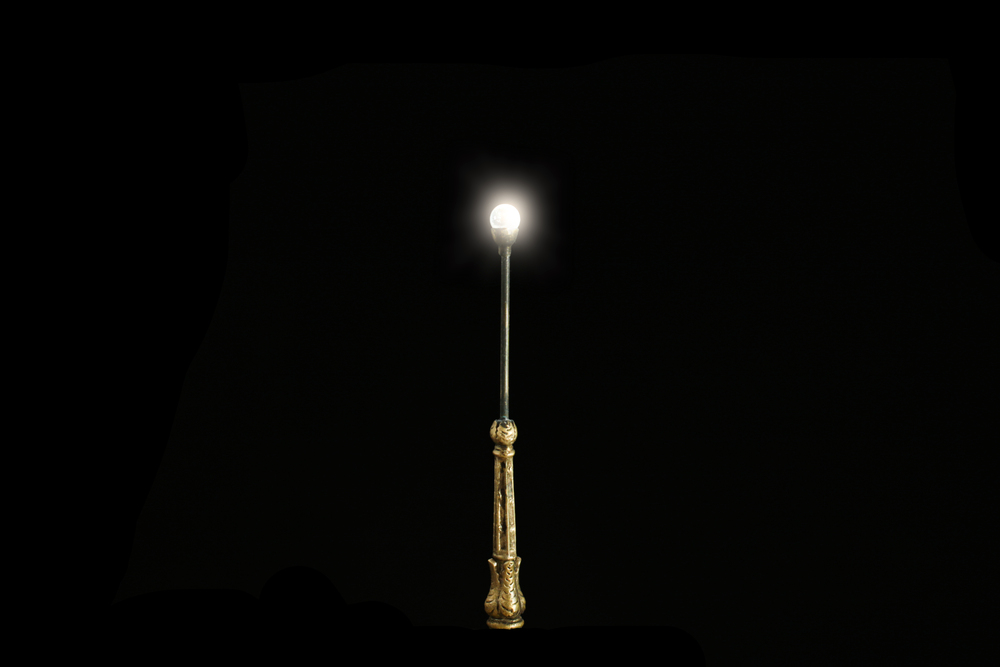 Lampione civile realizzato in ottone microfuso e boule in vetro. La boule in vetro è illuminata con led SMD a luce bianco caldo.