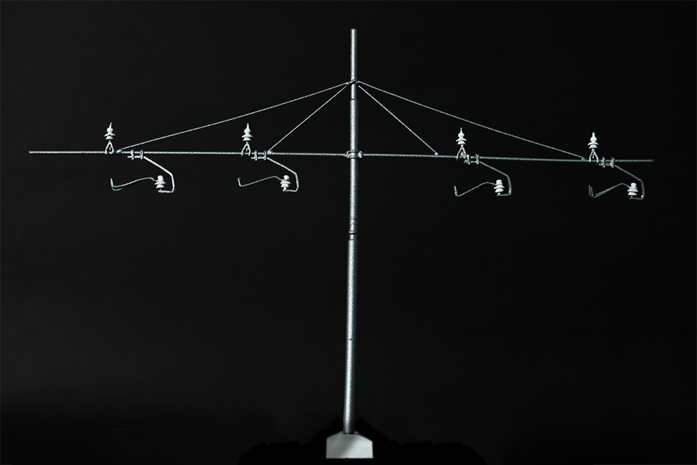 Il modello riproduce il palo utilizzato in stazione (M30), nel periodo antecedente agli anni ’70, dotato quindi al vero di isolatori ceramici.