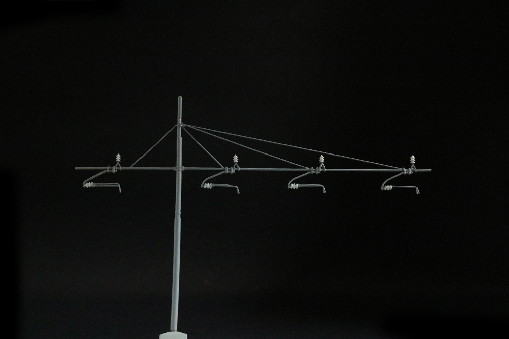 Palo per catenaria a corrente continua realizzato in ottone e bronzo microfusi. Il modello riproduce il palo utilizzato in stazione (M30), nel periodo successivo agli anni ’70, dotato quindi al vero di isolatori in materiale plastico. L'articolo viene proposto montato mediante saldatura a laser e dipinto; a richiesta, senza sovrapprezzo, su misure del cliente.