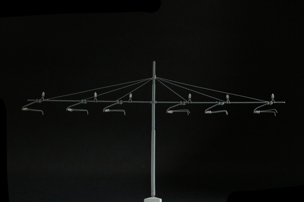 Palo per catenaria a corrente continua realizzato in ottone e bronzo microfusi. Il modello riproduce il palo utilizzato in stazione (M30), nel periodo successivo agli anni ’70, dotato quindi al vero di isolatori in materiale plastico. L'articolo viene proposto montato mediante saldatura a laser e dipinto; a richiesta, senza sovrapprezzo, su misure del cliente.