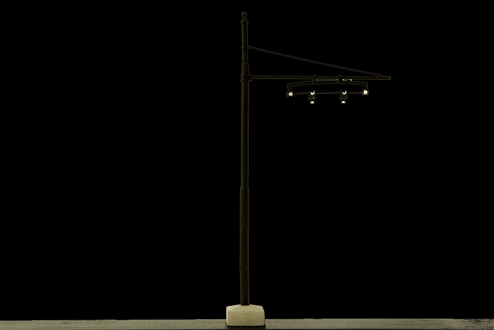 Palo per alimentazione trifase in ottone e bronzo microfusi, archetto con punti di contatto a pantografo. Fornito montato e dipinto in nero opaco.