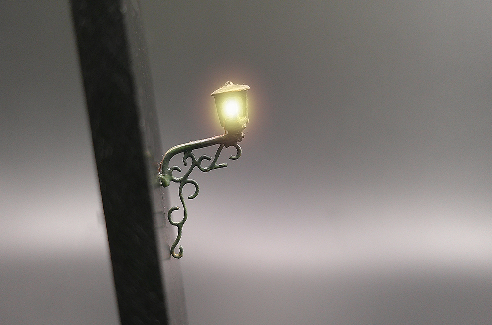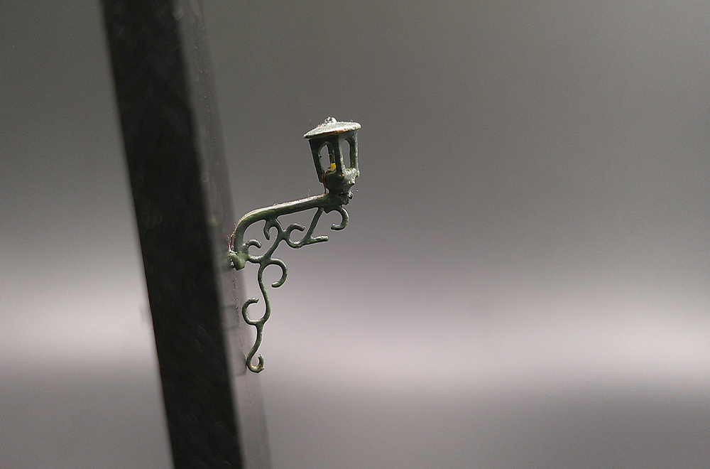Luce a muro realizzata in ottone microfuso, illuminata da luce gialla tenue con led SMD, lanterna rifinita con resina trasparente effetto vetro.