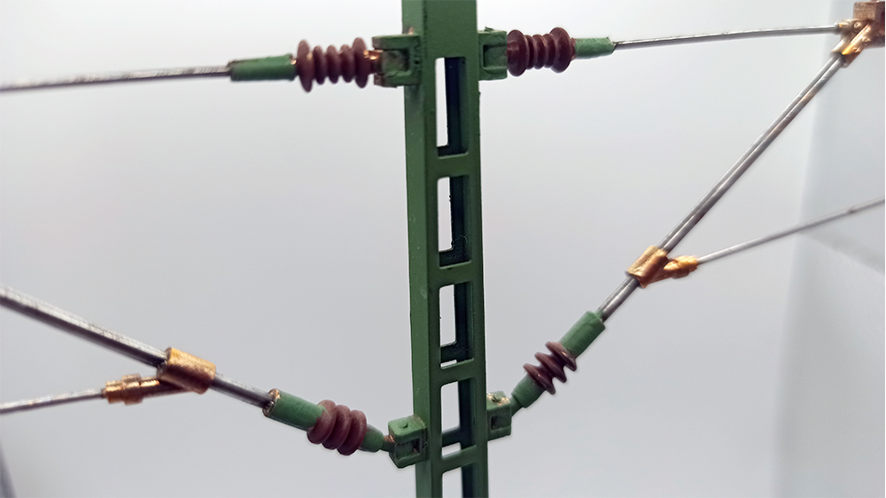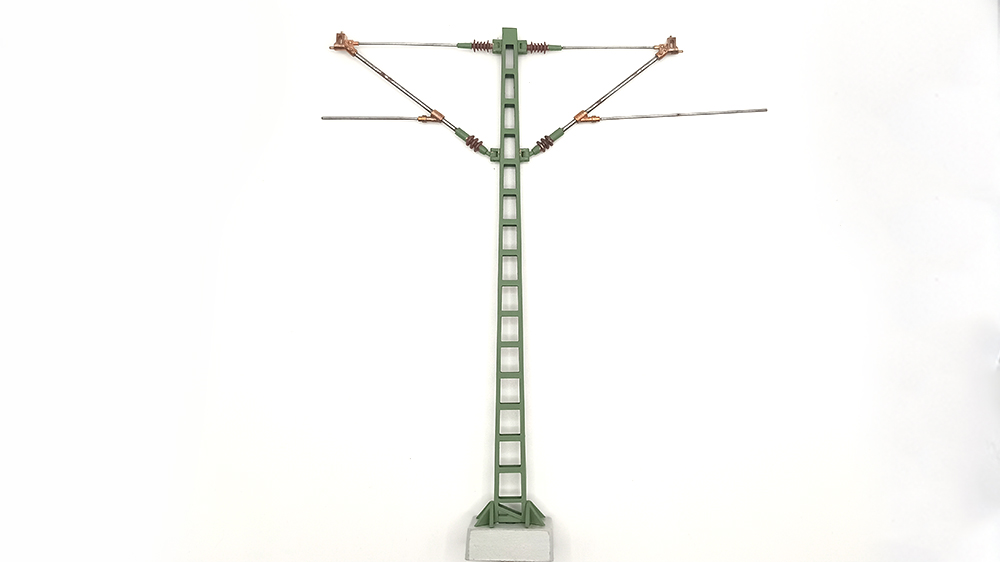 Handgefertigte Oberleitung aus Messingguss, Stahl und fotogeätztem Messing; Harzbasis. Die Mast ist hoch mm. 235,00; die Basis mm. 20.00 Uhr.