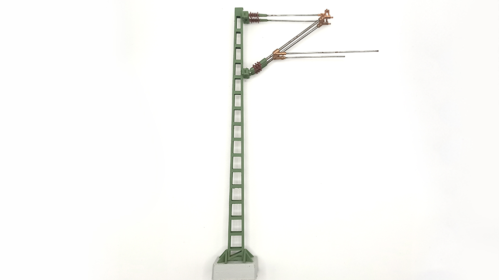 Handgefertigte Oberleitung aus Messingguss, Stahl und fotogeätztem Messing; Harzbasis. Die Mast ist hoch mm. 235,00; die Basis mm. 20.00 Uhr.
