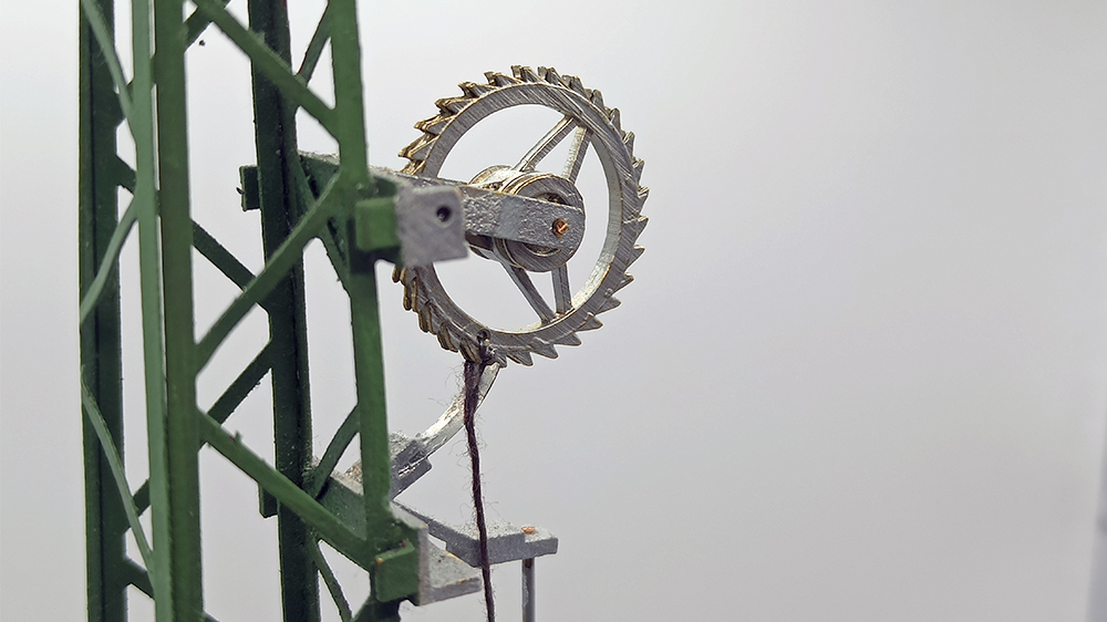 Handgefertigte Radspannwerk aus Messingguss, Stahl und fotogeätztem Messing; Harzbasis. Die Mast ist hoch mm. 255,00; die Basis mm. 20.00 Uhr. Die Mast ist in grünem DB lackiert und ist mit einer Schraube zur Befestigung ausgestattet.