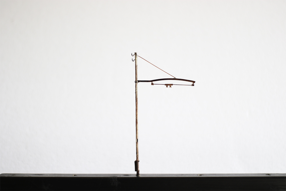 Riproduzione in ottone microfuso e filo di bronzo trafilato del palo in legno presente sulla linea RhB e MOB. Il palo, con la mensola del sistema « Alioth » (precedente al sistema « Otth »), a due isolatori sulla parte superiore.