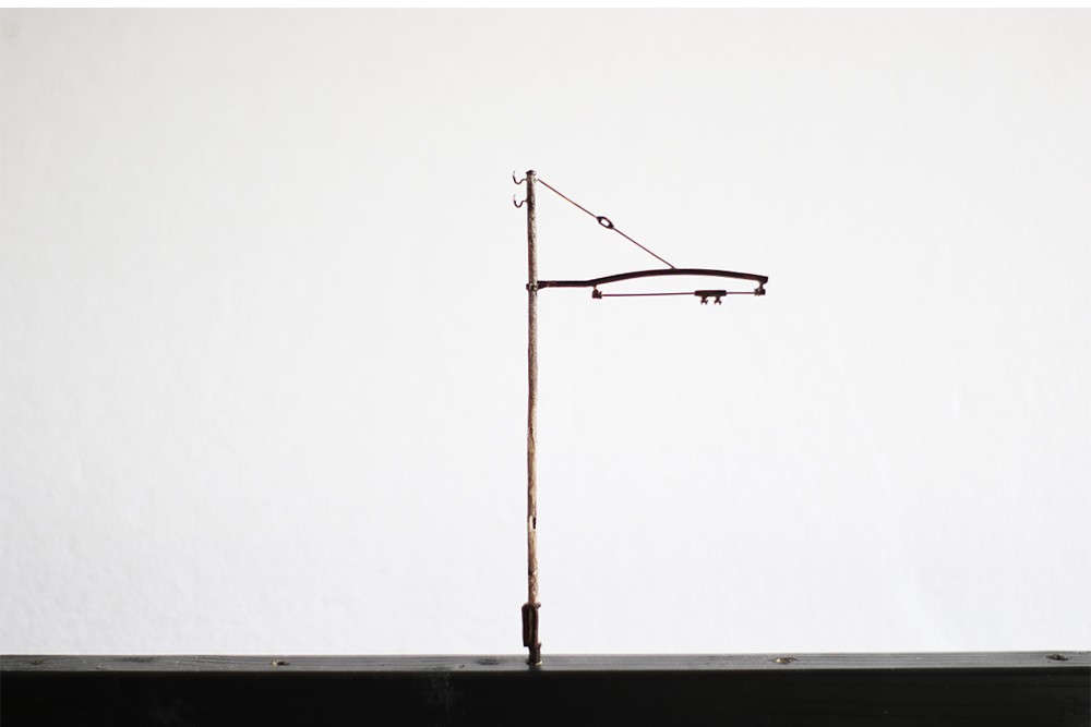 Riproduzione in ottone microfuso e filo di bronzo trafilato del palo in legno presente sulla linea RhB e MOB. Il palo, con la mensola del sistema « Alioth » (precedente al sistema « Otth »), a due isolatori sulla parte superiore.