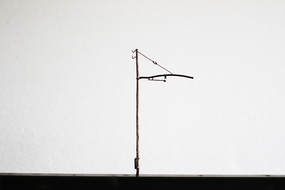 Riproduzione in ottone microfuso e filo di bronzo trafilato del palo in legno presente sulla linea RhB e MOB. Il palo, con la mensola del sistema « Otth », ha due isolatori sulla parte superiore.