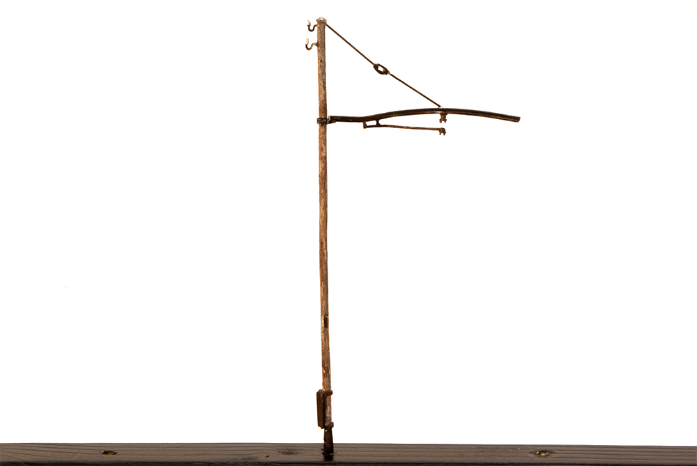 Riproduzione in ottone microfuso e filo di bronzo trafilato del palo in legno presente sulla linea RhB e MOB. Il palo, con la mensola del sistema « Otth », ha due isolatori sulla parte superiore.
