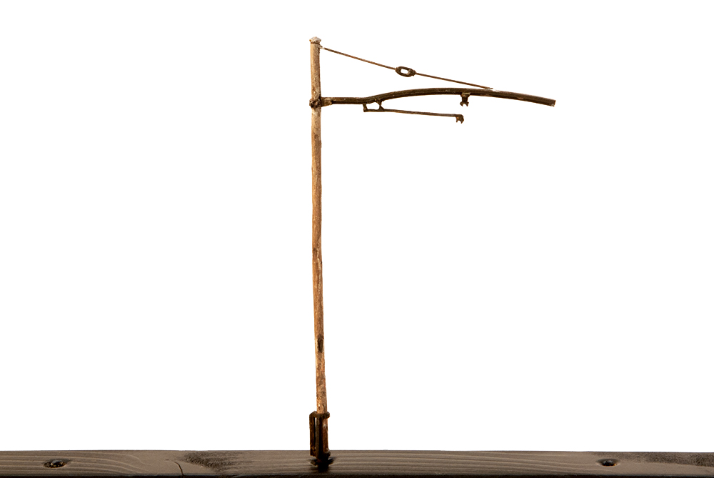 Riproduzione in ottone microfuso e filo di bronzo trafilato del palo in legno presente sulla linea RhB e MOB. Il palo, con la mensola del sistema « Otth », ha due isolatori sulla parte superiore.